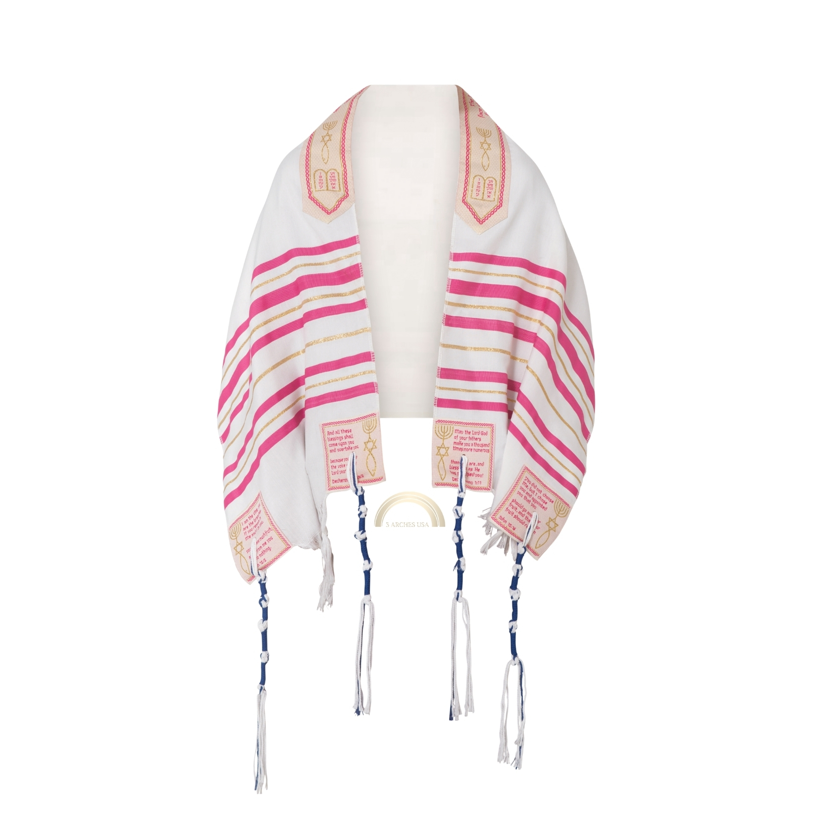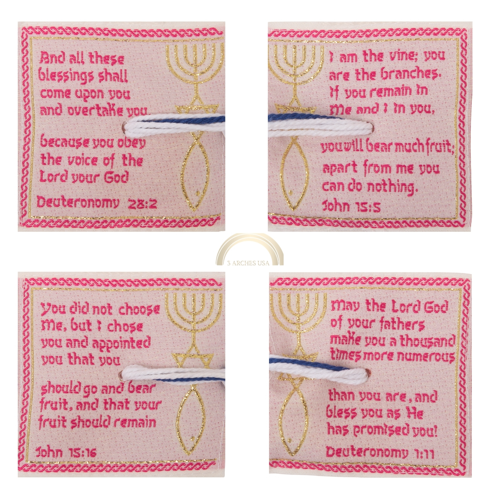 • Messianic symbols and English scriptures adorn the four corners, offering meaningful reflection. Prayer shawls from Israel and this new covenant prayer shawl incorporate ancient traditions