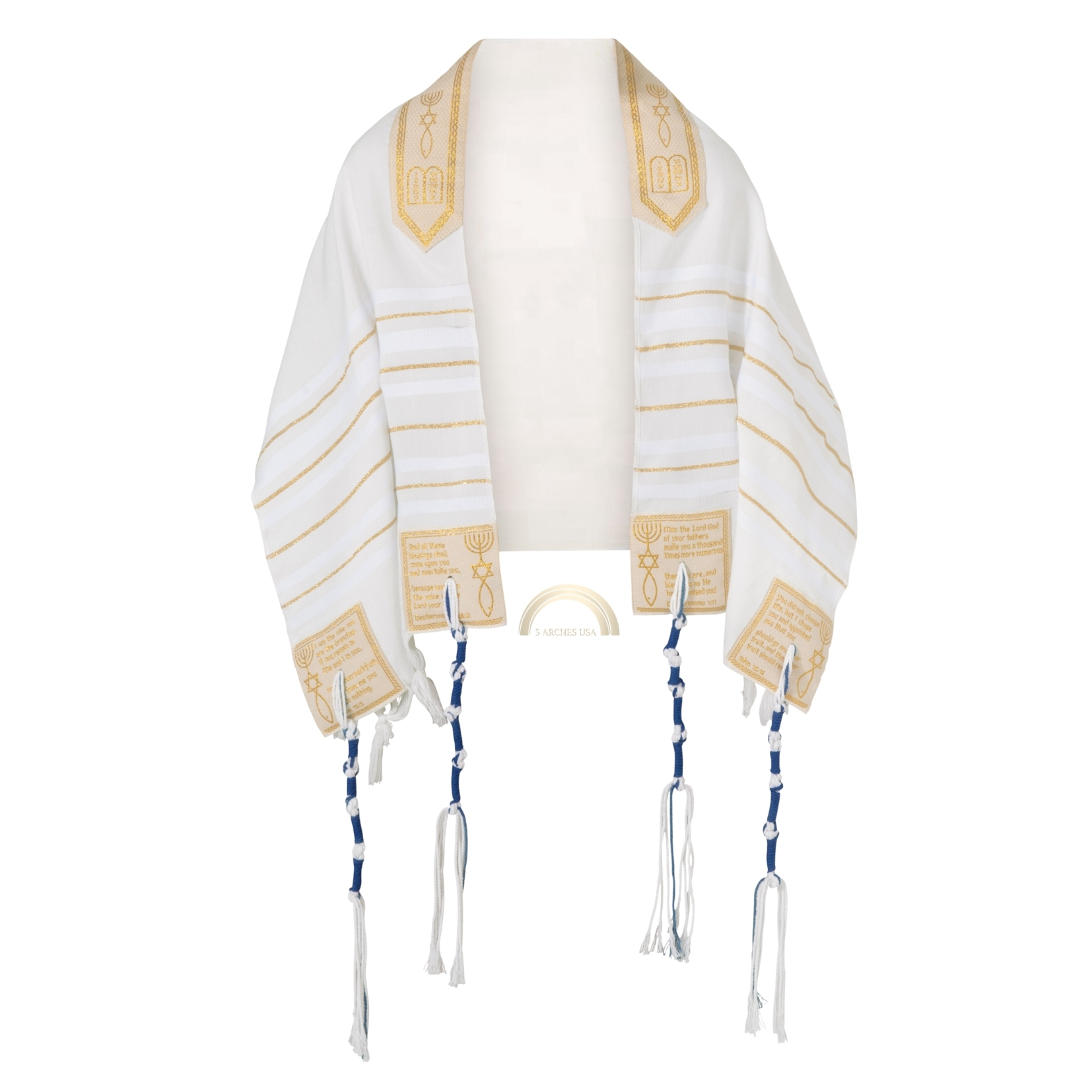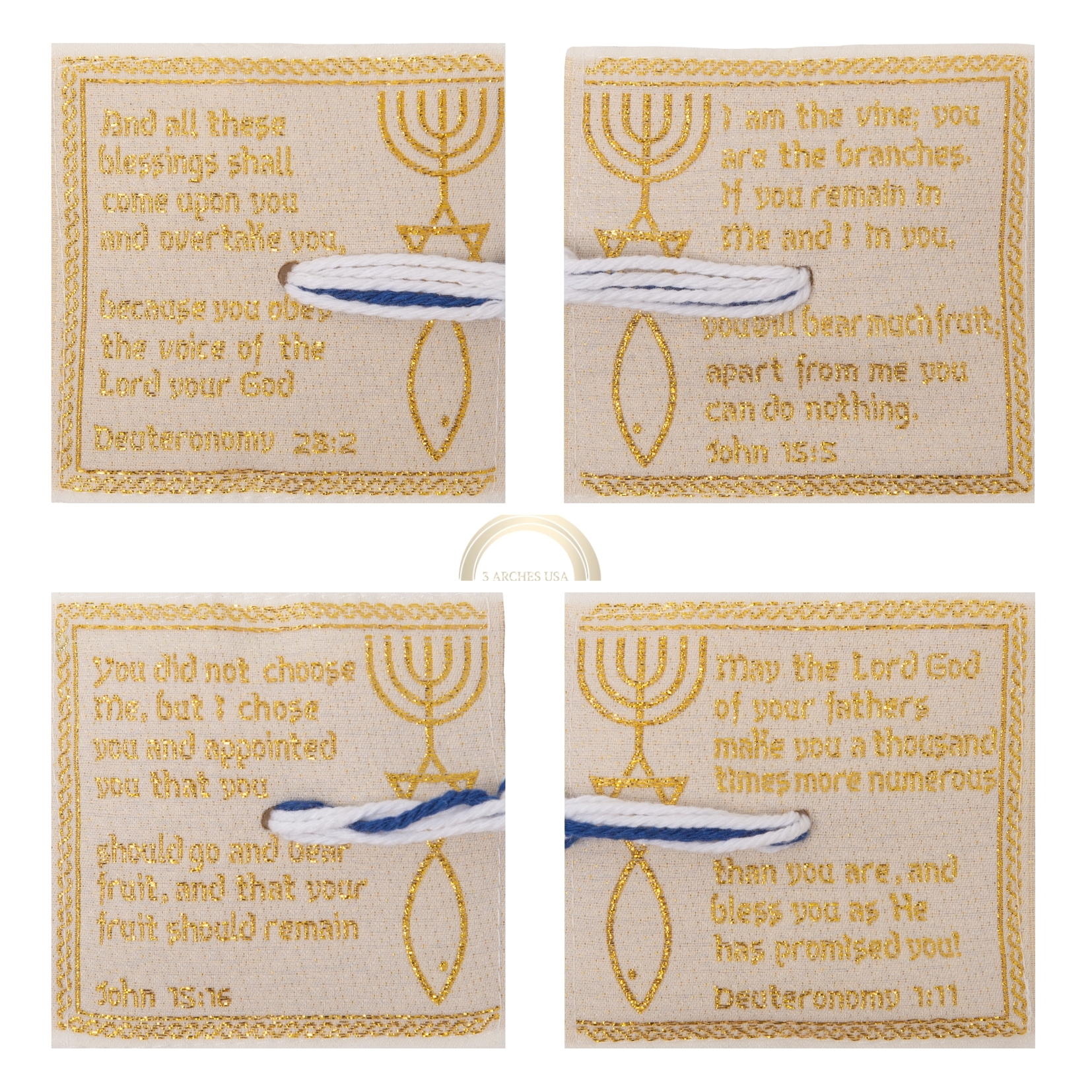 • Messianic symbols and English scriptures adorn the four corners, offering meaningful reflection. Prayer shawls from Israel and this new covenant prayer shawl incorporate ancient traditions